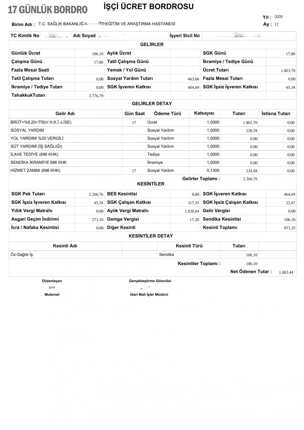 OCAK AYI MAAŞ - 17 GÜNLÜK BORDRO