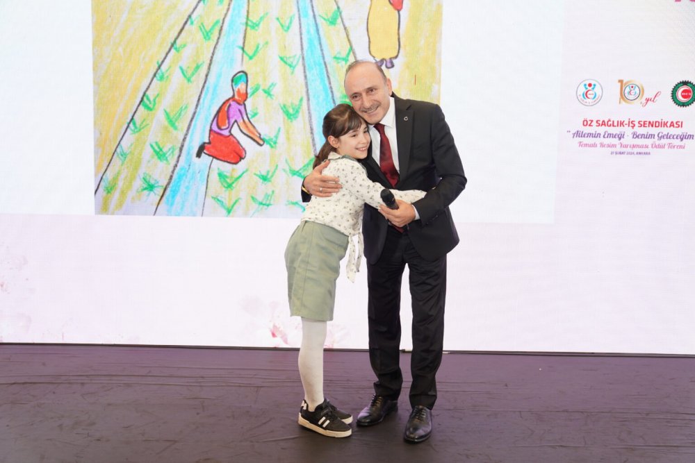 Sendikamız resim yarışmasının özel ödülünü 6 Şubat’ta depremlerinde yaralanan Üyemiz Zekai Ersoy’un kızı Zehra Ersoy’a teslim eden Genel Başkanımız Sert, “Zehra hastanede kendisini ziyaret ettiğimiz sırada resim yapıyordu ve bizler için de resim yapmak istediğini söyledi. Aslında depremden önce resim yarışmasına katılım süresi sona ermişti ama Zehra’mızın iyileşip resmini yapabilmesi adına ve diğer depremzede öğrencilerimize de fırsat vermek üzere Jürimizin de iznini alarak süreyi uzattık. Şuan aramızda olan Zehra kızımıza kocaman bir alkış istiyorum” dedi.