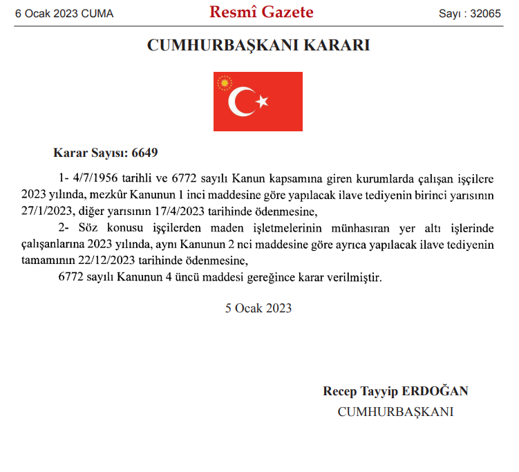 Cumhurbaşkanı Recep Tayyip Erdoğan'ın imzasıyla Resmi Gazete'de yayımlanan karara göre ilave tediye ödemeleri 27 Ocak ve 17 Nisan'da yapılacak.