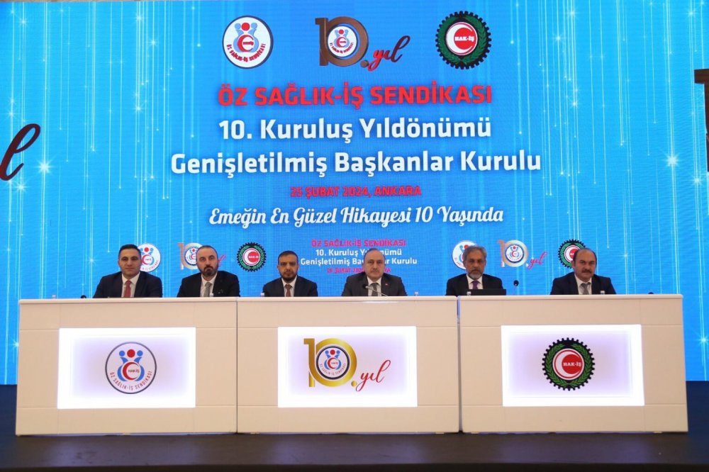 “10 Yaşındayız 100 yıllık sendikacılık geçmişi edindik neredeyse. Kamudaki en büyük sözleşmeleri imzalıyoruz kolay değil. Üye sayımız resmi istatistiklere göre 203 bin. Bu üyelerimizin 114.284’ü erkek, 91 bin 201 kadın üyemiz var. Kadınlarımıza özellikle çok büyük bir iş düşüyor. Teşkilatımızın yarısı erkek yarısı kadın üyemiz. Türkiye’nin en büyük 3. Sendikasıyız. Sağlık ve Sosyal Hizmet İşkolundaki liderliğimiz devam ediyor, çok şükür 81 ilde, 85 şube başkalığımız var. Öz Sağlık-İş’in yetkililerinin her yerde üyesinin yanında olması gerekiyor.”