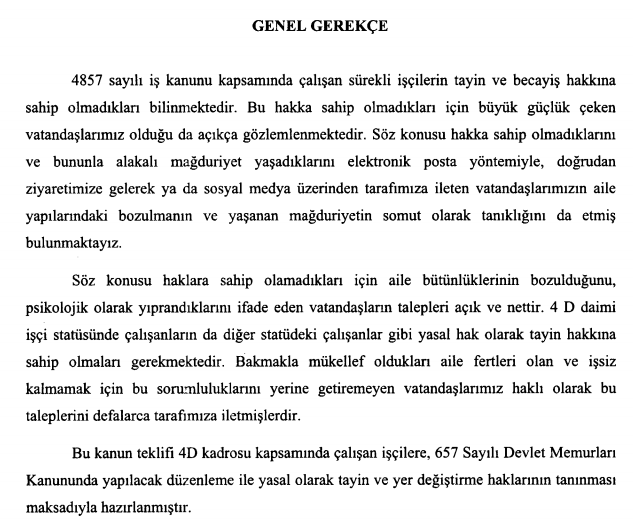 CHP İstanbul Milletvekili Turan Aydoğan tarafından meclise taşınan tasarıda tayin ve yer değiştirme için sunulan tasarı; “”Teklif ile, kamu kurum ve kuruluşlarında sürekli işçi olarak çalışanlara, tayin ve karşılıklı yer değiştirme haklarının tanınması amaçlanmaktadır.” ifadeleri yer alıyor.
