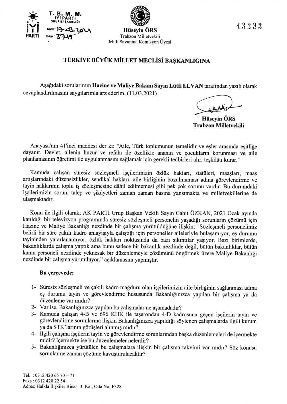 Konu ile ilgili olarak; AK PARTİ Grup Başkan Vekili Sayın Cahit ÖZKAN, 2021 Ocak ayında katıldığı bir televizyon programında süresiz sözleşmeli personelin yaşadığı sorunların çözümü için Hazine ve Maliye Bakanlığı nezdinde bir çalışma yürütüldüğüne ilişkin; "Sözleşmeli personelimiz belirli bir süre çakılı kadro anlayışıyla çalıştığı için personeller aileleriyle bulaşamıyor, eş durumu tayininden yararlanamıyor, özlük hakları noktasında da bazı sıkıntılar yaşıyor. Bazı birimlerde, bakanlıklarda çalışma yaptık ama bunu sadece bir bakanlık nezdinde değil, bütün bakanlıklar, bütün kamu personeli nezdinde yeknesak bir düzenlemeyle çözümünü öngörmek üzere Maliye Bakanlığı nezdinde bir çalışma yürütülüyor.” açıklamasını yapmıştır.
