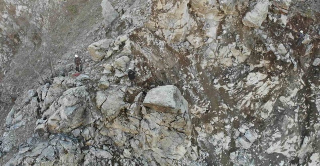 Profesyonel endüstriyel dağcı ekip sorumlusu Orhan Şimşek, "Endüstriyel dağcı olarak karayolları güzergahlarında tehlike oluşturan kayaların dökümünü yapıyoruz. Dün burada bir heyelan olmuş ve yol kapanmış. Heyelanlı bölgede akıntı devam ettiği için yolun trafiğe açılması çok riskli. Bizde ekip arkadaşlarımızla bölgeye geldik ve yamaca çıkarak kaya temizleme çalışmasına başladık. Öncelikli hedefimiz akıntıyı durdurmaktı bunu sağladık. Şimdi de yamaçta askıda olan büyük kütleleri düşürmek için çalışıyoruz.