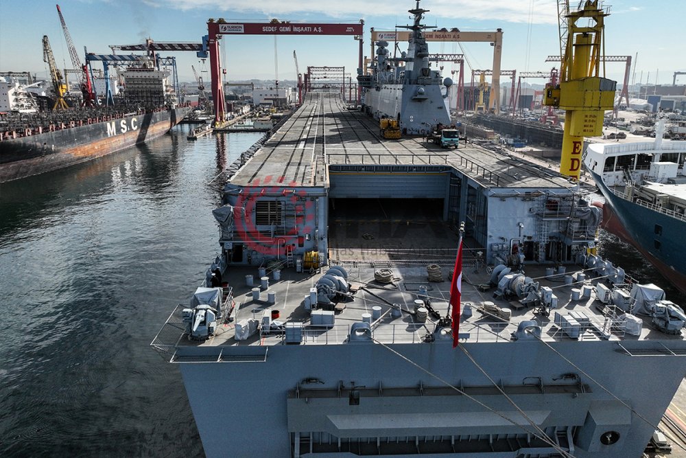 Türk Deniz Kuvvetleri'nin amiral gemisi olacak TCG Anadolu veya Anadolu L-400 isimli amfibik hücum gemisinin son durumu havadan görüntülendi. Büyük bir kısmı tamamlanan 231 metre uzunluğunda 32 metre genişliğindeki gemi tüm heybeti ile görenleri kendine hayran bırakıyor. TCG Anadolu ana yapılandırması bakımından Türkiye'nin amfibi hücum gemisi (LHD) sınıfına giren ilk gemi olma özelliğini taşıyor. 2014 yılında yapımına başlanan geminin çalışmalarında sona gelindi. TCG Anadolu tam donanımlı 8 helikopter bulundurabilecek. Geminin bir tabur tam teşekküllü askerin istenilen bölgeye sevkini sağlayabilme özelliği bulunuyor. Kıtalararası görevlere çıkabilecek elverişliliğe sahip olan geminin aktif olarak Mavi Vatan'ı koruması bekleniyor. 12 derecelik eğimi ile üzerinden savaş uçaklarının kalkışını kolaylaştıracak ve bu sayede helikopterler dışında uçakların kullanımında kolaylık sağlayacak rampa da eklenmiş. Gemide görev alması için ilerleyen zamanlarda kısa kalkış, dikey iniş yapabilen Lockheed Martin F-35B modeli veya farklı uçakların kullanılması planlanıyor.