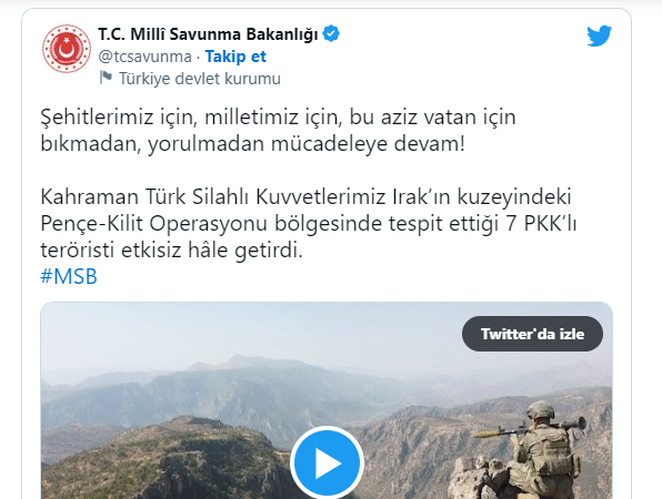 MSB'nin sosyal medya hesabından yapılan açıklamada, "Şehitlerimiz için, milletimiz için, bu aziz vatan için bıkmadan, yorulmadan mücadeleye devam! Kahraman Türk Silahlı Kuvvetlerimiz Irak'ın kuzeyindeki Pençe-Kilit Operasyonu bölgesinde tespit ettiği 7 PKK'lı teröristi etkisiz hale getirdi" ifadelerine yer verildi.