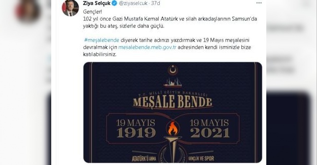 Bakan Selçuk, sosyal paylaşım sitesi Twitter hesabından yaptığı paylaşımda, “Gençler! 102 yıl önce Gazi Mustafa Kemal Atatürk ve silah arkadaşlarının Samsun’da yaktığı bu ateş, sizlerle daha güçlü. #Meşalebende diyerek tarihe adınızı yazdırmak ve 19 Mayıs meşalesini devralmak için http://mesalebende.meb.gov.tr adresinden kendi isminizle bize katılabilirsiniz” ifadelerine yer verdi.