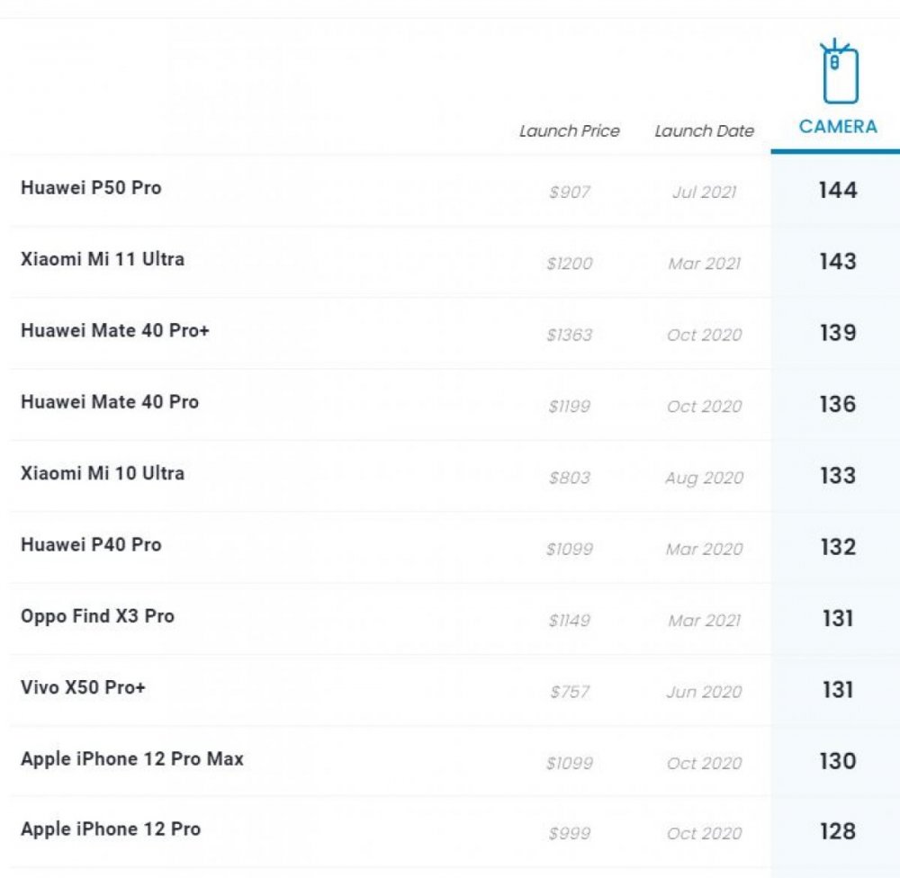 Yapılan değerlendirme sonunda henüz dün tanıtılan Huawei P50 Pro, 144 puan alarak en iyi kameraya sahip akıllı telefon oldu ve liderlik koltuğuna oturdu.