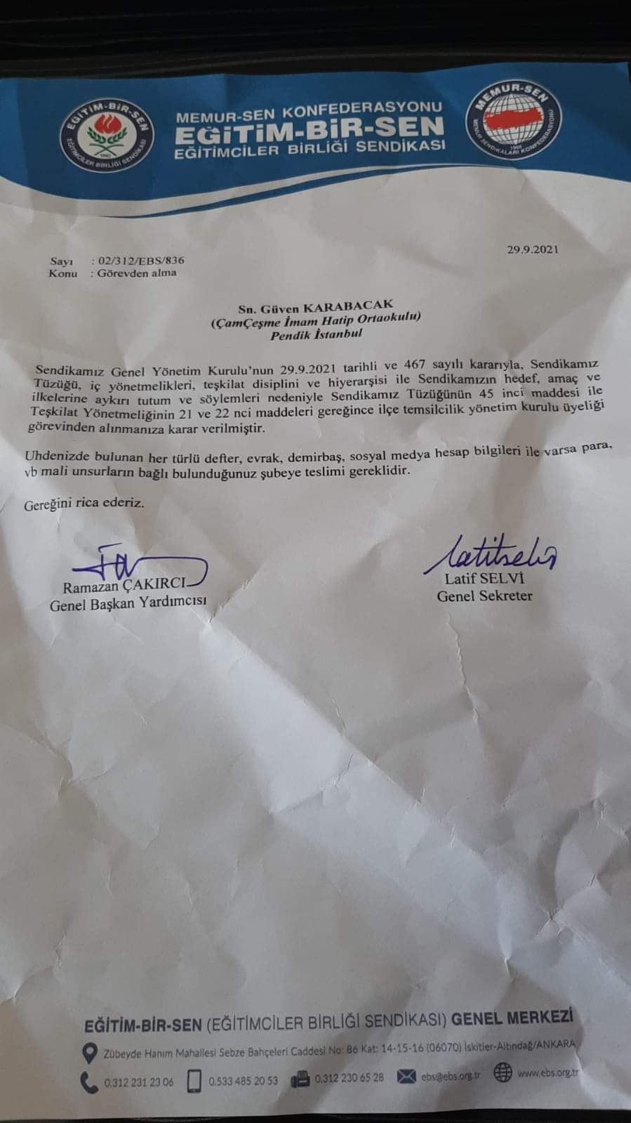 Üyesi bulunduğum Pendik ilçe yönetim kurulu üyeliğinden Eğitim Birsen 4 nolu şube başkanı Talat yavuz a itaat etmediğimiz, teşkilatı baba mülkü gibi kullanip, teşkilatı ve karar mercilerini devşirme. Ebs lidere teslim ettiği ve kişisel ikbali için her şeyi mubah görmesine itiraz ettiğimizden ve Sayın şube baskaninin kendi ifadesiyle parmak ucuna bakmadigimizdan dolayı genel merkezimiz tarafın ilçe yönetim kurulu görevinden alınmış bulunmaktayım