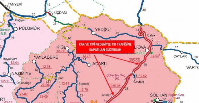 Bingöl Valiliğinden yapılan açıklamaya göre, yoğun kar yağışı nedeniyle Bingöl-Erzurum ile Bingöl-Diyarbakır karayolu tır trafiğine kapatıldı. Açıklamada, "Sürücülerimizin dikkatine. Bingöl-Erzurum karayolunun 0-39 ve 0-49 kilometreleri arası ile Bingöl-Diyarbakır karayolunun 0-9 ve 21-43 kilometreleri arası yoğun kar yağışı nedeniyle tır trafiğine kapatılmıştır" denildi.