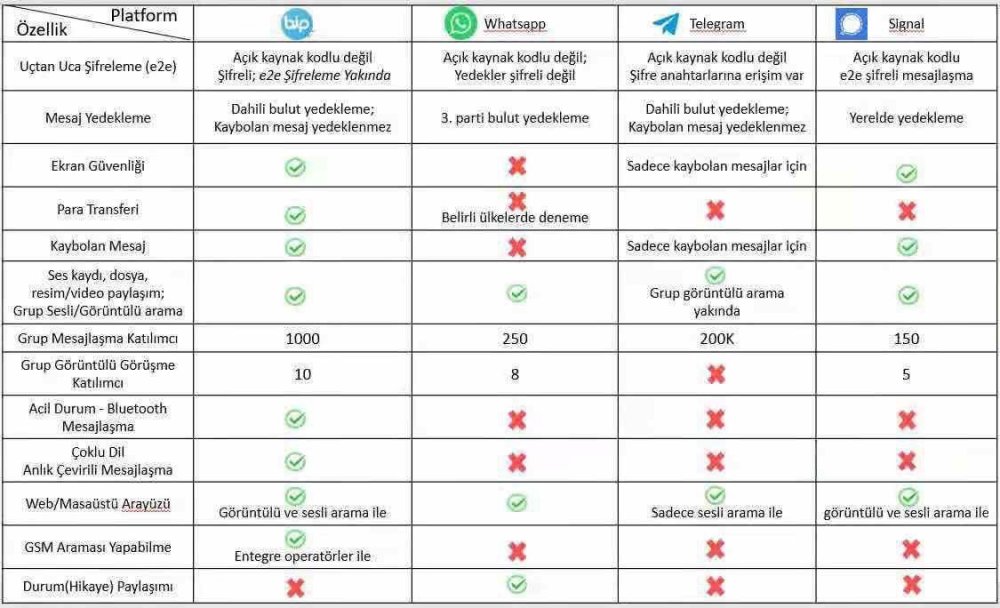 BİP, Whatsapp, Telegram ve Signal'in  Hepsinin güvenlik özellikleri bakımından  karşılaştırması yapıldığında  BİP'in  internetsiz ortamda dahil acil durum mesajı atmak ve şifreleme özellikleri ile öne çıkıyor.