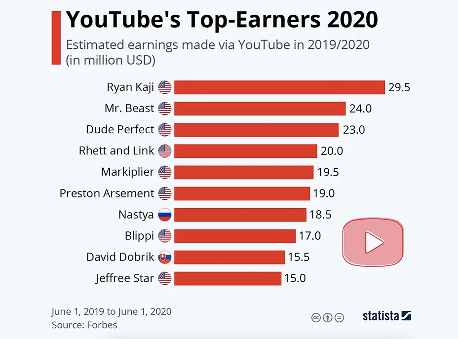 Youtube'dan en çok kazanan youtuberlar listesinde ilk sıra son 3 yıldır aynı kişide ve bu 9 yaşında bir çocuk! Yanlış okumadınız! Ryan's World isimli kanalında çocuklara yönelik videolar paylaşan Ryan Kaji'nin 27,6 milyon abonesi var ve 2020'de Youtube'dan 9,5 milyon dolar yani neredeyse 225 milyon TL kazanmış.
