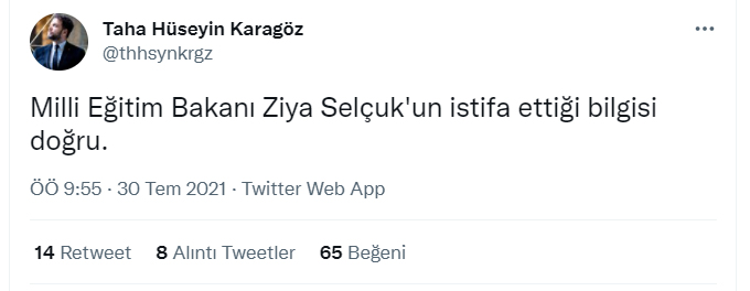 2-MEB Ziya Selçuk’un istifa ettiği ve bu istifanın da kabul edilerek, kesinleştiği bilgisi geldi. @tcmeb @ziyaselcuk" ifadelerini kullandı.