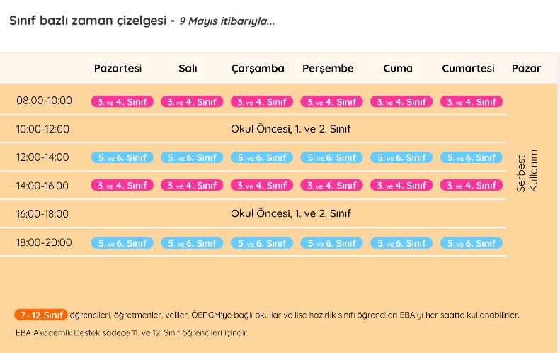 EBA Öğrenci Girişi Sınıf Bazlı Zaman Çizelgesi