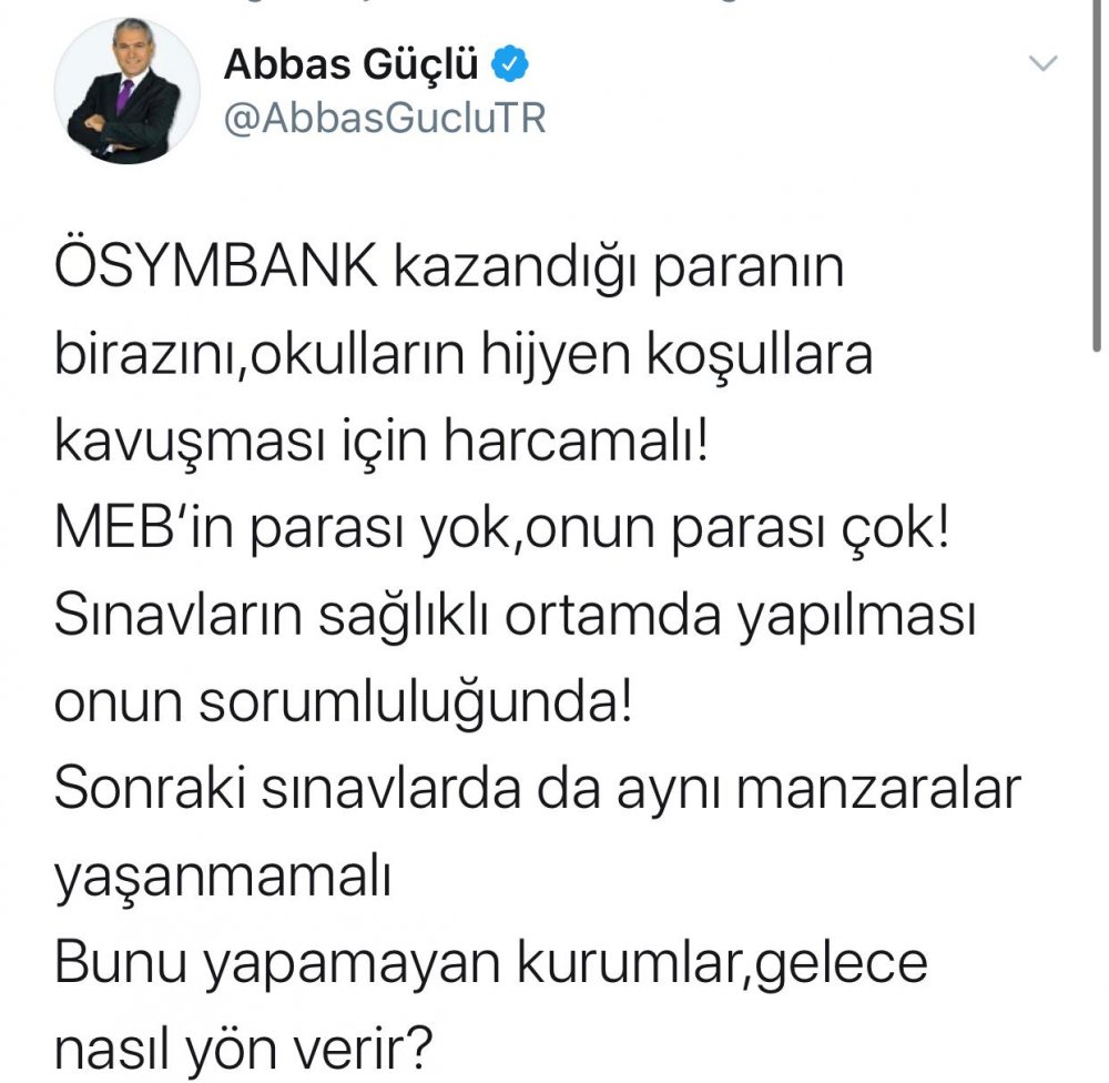 Eğitim yazarı Abbas Güçlü, ÖSYMBANK kazandığı paranın birazını,okulların hijyen koşullara kavuşması için harcamalı! diyerek, ÖSYM'ye gönderme yaptı.