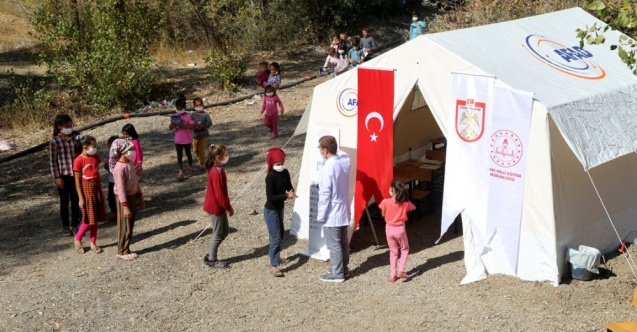 Ailelerin çadırlarının yan kısmında oluşturulan mobil sınıfa, İl Milli Eğitim Müdürlüğünce de öğretmen görevlendirmeleri yapıldı.