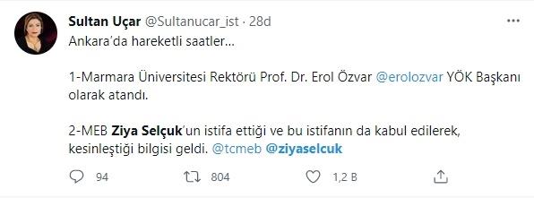 Sözcü Gazetesi Eğitim Editörü Sultan Uçar MEB için 2 ismin ön plana çıktığını söyledi. Uçar açıklamasında; "Marmara Üniversitesi’nin, Resmî Gazete’den önce yazdığı ve uyarılıp sildiği öğrenilen bu tweet sonrası @ziyaselcuk un istifa ettiği, istifasının kabul edildiği bilgisiyle ilgili Ankara sessizliğe gömüldü.