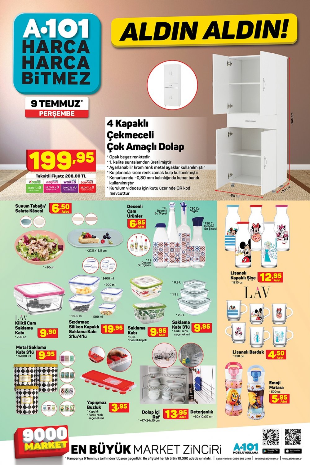 Yine a101 marketlerinde 9 temmuz tarihinden itibaran eviniz için çok amaçlı dolap,yine mutfakların vazgeçilmez ürünlerinden olan desenli cam ürünler,cam ve metal saklama kabları , gıda ürünlerinde ise piliç pirzola,beyaz peynir,çay , şeker , dondurma ve daha bir tüketebileceğiniz gıda ürünü sizleri bekliyor. Sizlerde haberimizde bulunan A101 Aktüel Ürünler Kataloğu 9 Temmuz kataloğunu inceleyerek ürünlerin fiyatlarının araştırabilir fiyat analizleri yapabilirsiniz.