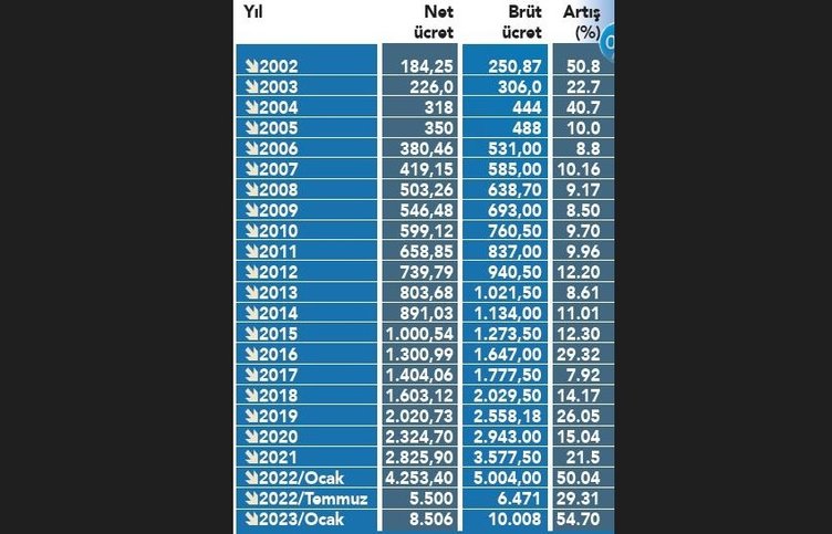 AK Parti'nin tarihi zaferle çıktığı seçimlerin ardından asgari ücrete ara zam, memur ve emekliye enflasyonla beraber refah payı mesaisi başlıyor. AK Parti'nin iktidara geldiği 2002'de 184 lira olan net asgari ücret 2023'te bir önceki yıla oranla yüzde 54.7 artışla 8 bin 506 lira (Brüt 10 bin 8 lira) olarak belirlendi.