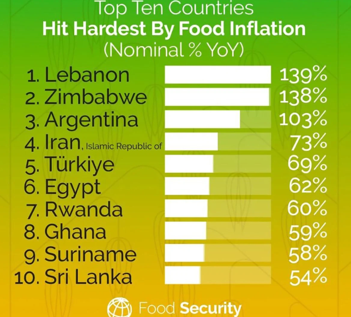 TÜİK'ten alınan verilere göre Türkiye'de yıllık gıda enflasyonu yüzde 69 olarak gerçekleşti. Türkiye; Lübnan, Zimbabve, Arjantin ve İran'ın ardından beşinci sırada yer aldı. İlk 10'u tamamlayan ülkeler ise Mısır, Ruanda, Gana, Surinam ve Sri Lanka oldu.