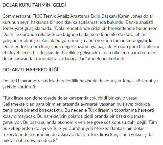 Karen Jones Dolar'ın kaç TL seviyesine geleceği konusunda da tahmin yayımladı ve açıklamasında, “Türk lirası karşısında dolar kurunun yükseliş hareketine değindik. Bu hareket neticesinde orta vadede kur 8,30 TL'yi hedefleyebilir. Bunun ekonomik ve jeopolitik verilerle desteklenmesi gerekiyor. Bu seviye bir hedef halinde bulunuyor. Aşılması durumunda ise Türk lirası adına çok başka şeyler konuşmak gerekebilir.”