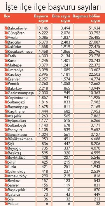 İstanbul'da 1999 yılı öncesi inşa edilen binaların en çok olduğu ilçelerin başında Fatih, Üsküdar, Bağcılar, Küçükçekmece, Kartal ve Maltepe geliyor. Fatih'te 2 bin 134 binada 23 bin 778 bağımsız bölüm, Üsküdar'da 1919 binada 22 bin 475 bağımsız bölüm, Bağcılar'da 2 bin 483 binada 27 bin 87 bağımsız bölüm, Küçükçekmece'de 1.866 binada 25 bin 796 bağımsız bölüm, Kartal'da 1.401 binada 20 bin 743 bağımsız bölüm, Maltepe'de 1.241 binada 22 bin 372 bağımsız bölüm için başvuru yapıldı.
