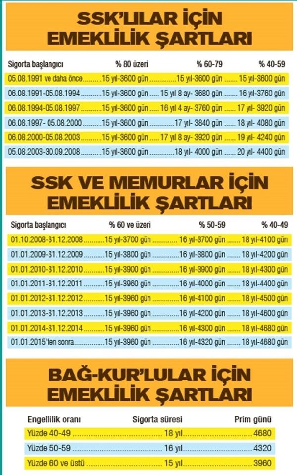 1 Ekim 2008 tarihinden itibaren Bağ- Kur (4/B) sigortalıların da engelli olarak erken emekliliklerinin yolu açıldı. Buna göre, yüzde 60 ve üzeri engeli olanlar 15 yıl 3 bin 960 gün, yüzde 50 ile 59 arasında olanlar 16 yıl 4 bin 320 gün, yüzde 40-49 arasında olanlar ise 18 yıl 4 bin 680 günden emekli olabilecek.