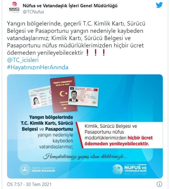 Nüfus ve Vatandaşlık İşleri Genel Müdürlüğü'nün sosyal medya hesabından yapılan açıklamada "Yangın bölgelerinde geçerli T.C. Kimlik Kartı, Sürücü Belgesi ve Pasaportunu yangın nedeniyle kaybeden vatandaşlarımız; Kimlik Kartı, Sürücü Belgesi ve Pasaportunu nüfus müdürlüklerimizden hiçbir ücret ödemeden yenileyebilecektir" denildi.