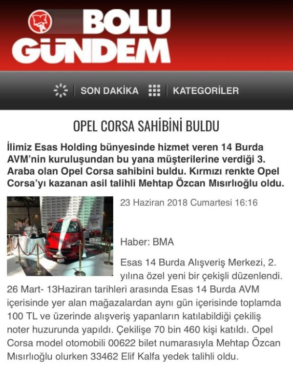 2017'de Bolu 14 Burda Alışveriş Merkezi'nin araba çekilişinden Audi A3 marka otomobil kazanan CHP'li Özcan ailesinin ardından 2014 yılında yerel seçimlerde CHP'nin Bolu Belediye Başkan adayı olan Mehtap Ö. M'nin de 2018'de çekilişe katılan 70 bin 460 kişi arasında son model Opel Corsa marka araba kazanan talihli olduğu anlaşıldı. CHP'li isimlerin arka arkaya araba çekilişi talihlisi olması şanstan öte bir skandal olarak nitelendirildi.'