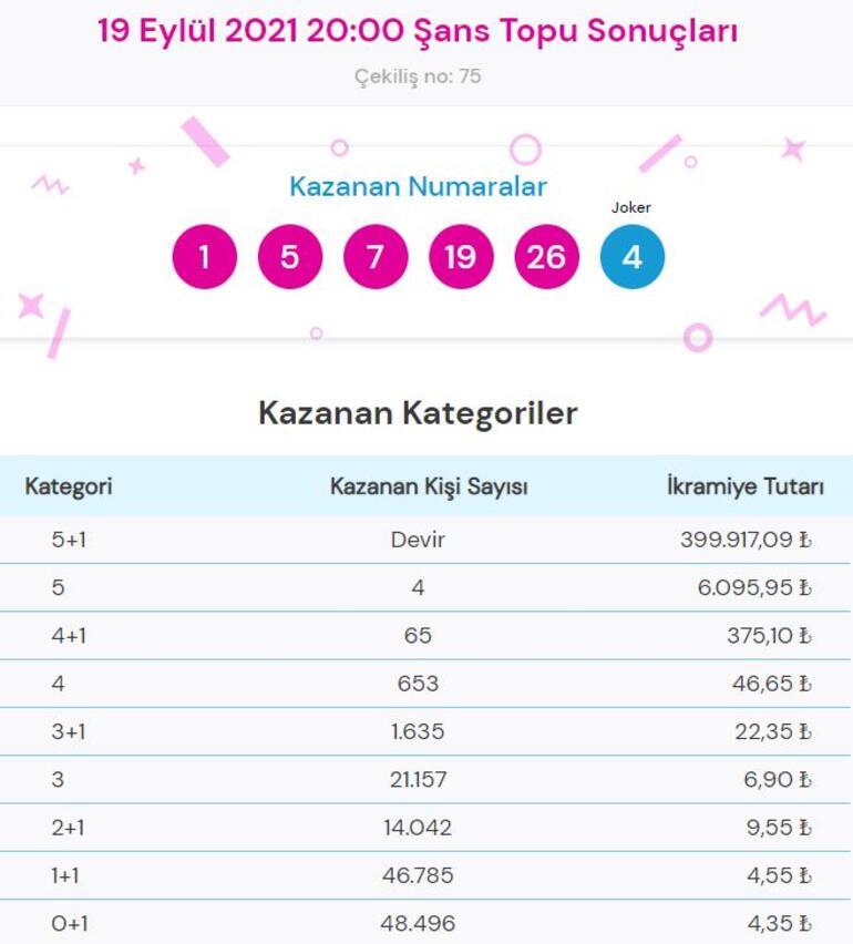 Sisal Şans ile kazandırmaya devam eden Şans Topu'nda çekiliş heyecanı yaşandı. 19 Eylül Şans Topu çekilişinde büyük ikramiye 399 bin 917 TL. 19 Eylül 2021 Şans Topu çekilişi sonucu kazandıran şanslı numaralar -1-5-7-19-26- ve +4 oldu.