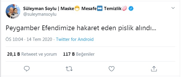 Bakan Soylu, sosyal medya üzerinden yaptığı açıklamada "Peygamber Efendimize hakaret eden pislik alındı..." ifadelerini kullandı.