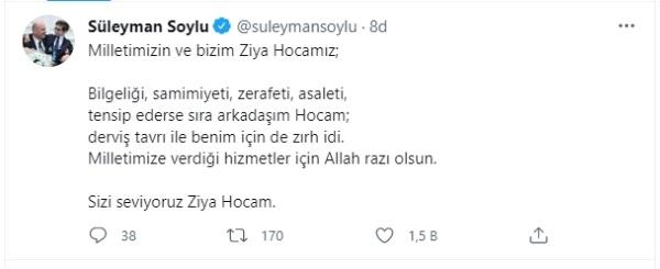 Bakan Soylu, Ziya Selçuk için 'Derviş tavrı ile benim için de zırh idi.' ifadesini kullandı.