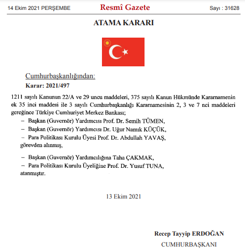Cumhurbaşkanlığından Merkez Bankasında görevden alama ve yapılan atamalar bugünkü resmi gazetede yayımlandı.