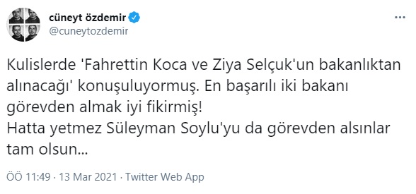 “Kulislerde 'Fahrettin Koca ve Ziya Selçuk'un bakanlıktan alınacağı' konuşuluyormuş. En başarılı iki bakanı görevden almak iyi fikirmiş! Hatta yetmez Süleyman Soylu'yu da görevden alsınlar tam olsun...”