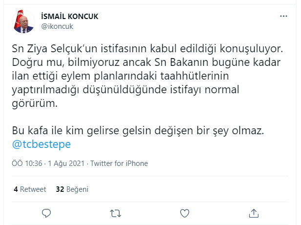 ''Sn Ziya Selçuk’un istifasının kabul edildiği konuşuluyor. Doğru mu, bilmiyoruz ancak Sn Bakanın bugüne kadar ilan ettiği eylem planlarındaki taahhütlerinin yaptırılmadığı düşünüldüğünde istifayı normal görürüm. Bu kafa ile kim gelirse gelsin değişen bir şey olmaz.'' dedi.