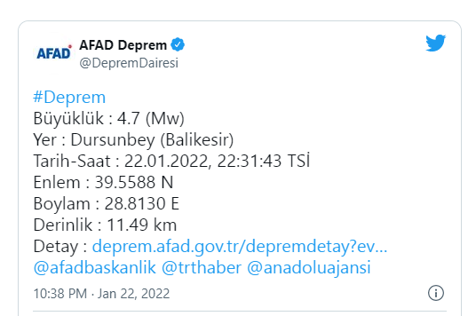 Kandilli Rasathanesi ve Deprem Araştırma Enstitüsünden alınan bilgiye göre, saat 22.31'de merkez üssü Balıkesir'in Dursunbey ilçesi Ayvacık olan 4.8 büyüklüğünde bir deprem meydana geldi. Deprem çevre illerde de hissedildi.