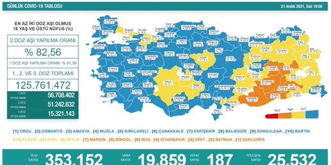 Türkiye'de son 24 saatte 353 bin 152 Kovid-19 testi yapıldı, 19 bin 859 kişinin testi pozitif çıktı, 187 kişi yaşamını yitirdi.