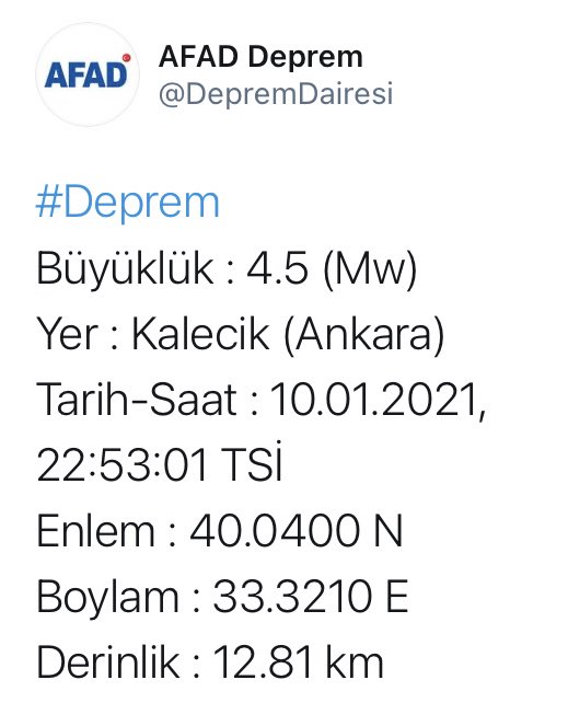 AFAD'dan alınan bilgiye göre, saat 22.53'te merkez üssü Ankara'nın Kalecik ilçesi olan 4.5 büyüklüğünde bir deprem meydana geldi.