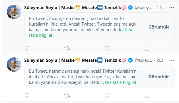 Twitter, İçişleri Bakanı Süleyman Soylu'nun iki paylaşımı hakkında kısıtlama getirdi.