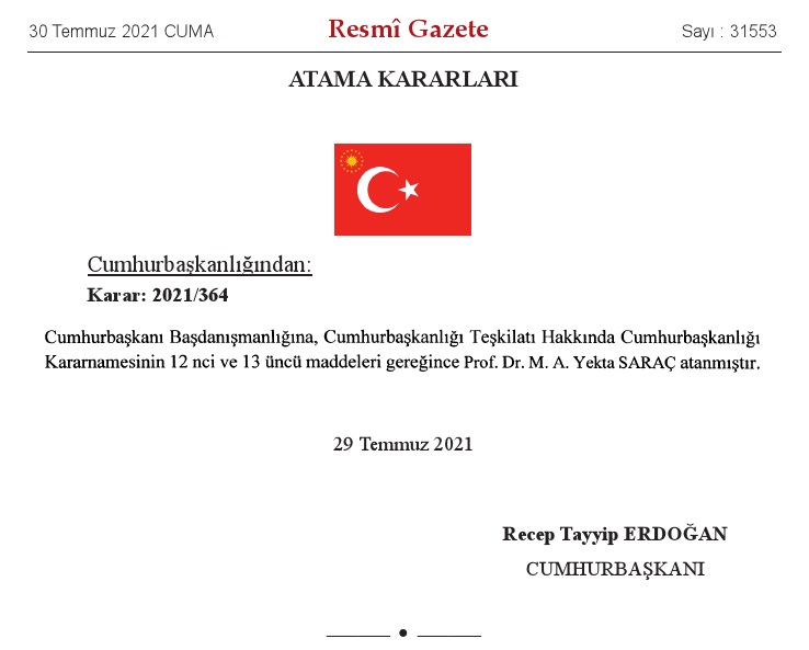 Cumhurbaşkanı Başdanışmanlığına, Cumhurbaşkanlığı Teşkilatı Hakkında Cumhurbaşkanlığı Kararnamesinin 12 nci ve 13 üncü maddeleri gereğince Prof. Dr. M. A. Yekta SARAÇ atanmıştır.