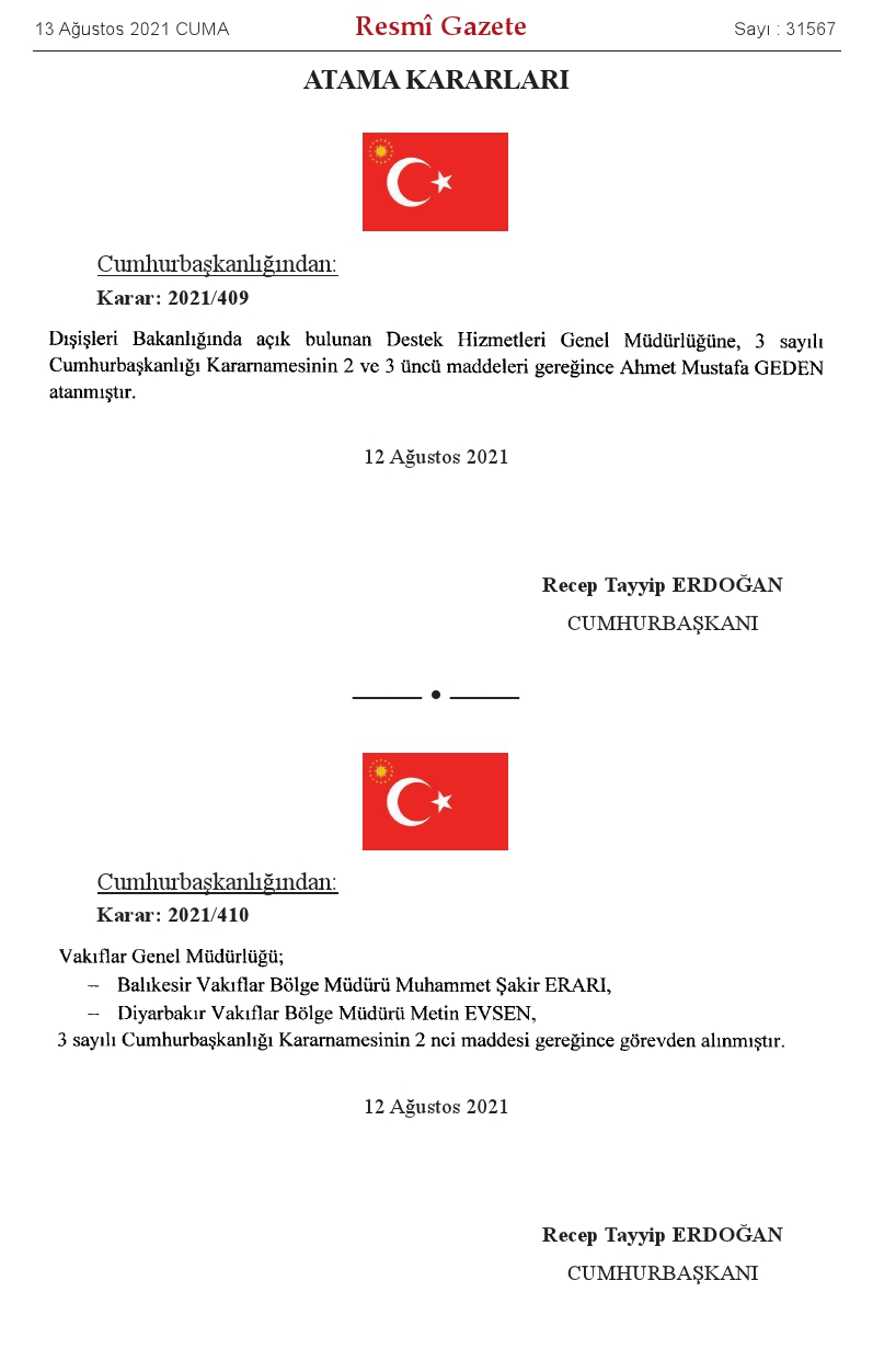 13 Ağustos 2021 tarihli Resmi gazetede yayımlanan karara göre Dışişleri Bakanlığı, Destek Hizmetleri Genel Müdürlüğüne, Ahmet Mustafa GEDEN Atandı. Vakıflar Genel Müdürlüğü, Balıkesir Vakıflar Bölge Müdürü ve Diyarbakır Vakıflar Bölge Müdürü, Muhammet Şakir ERARI ve Metin EVSEN görevden alındı.