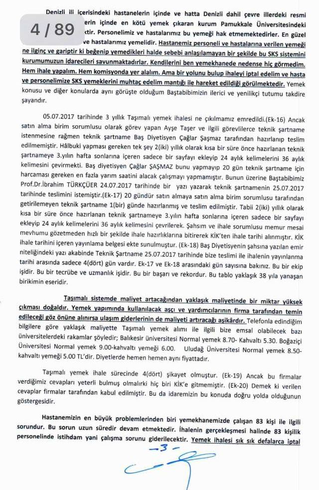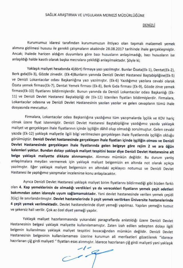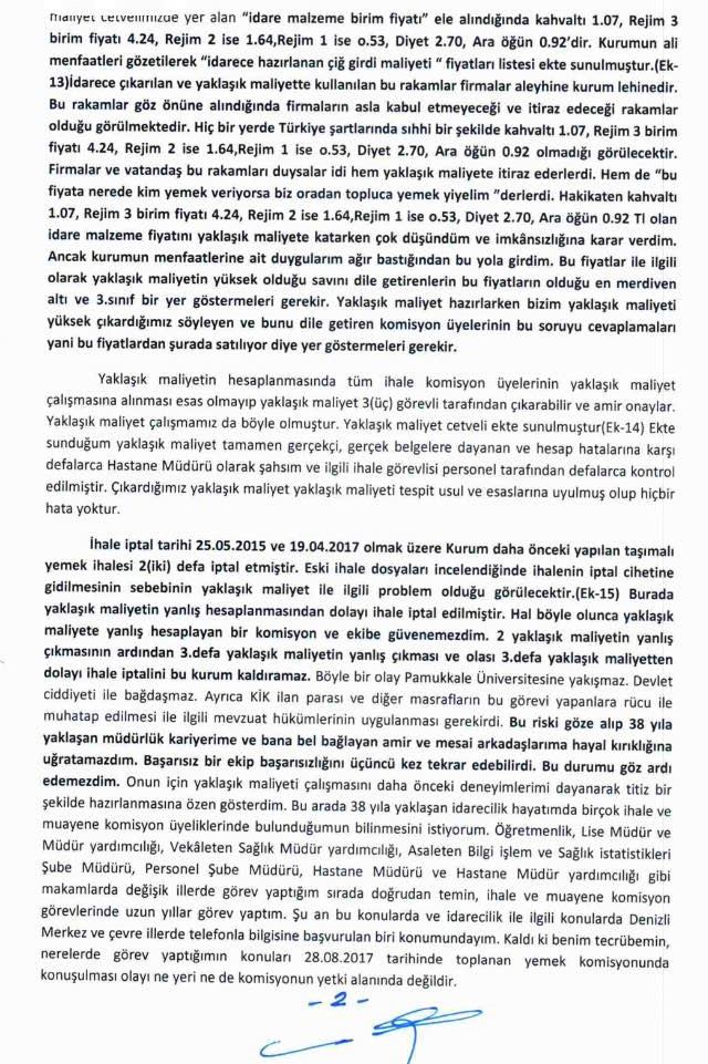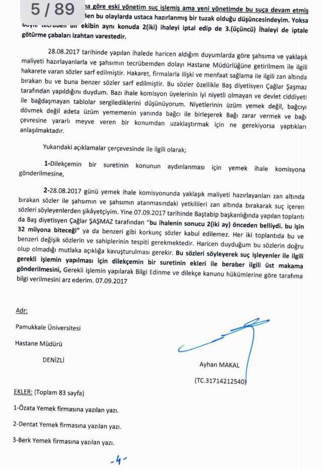 Skandal yemek ihalesinden kısa bir süre önce Pamukkale Üniversitesi Hastaneleri Başmüdürlüğüne getirilen Ayhan Makal imzalı bu belgeye göre;