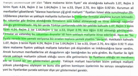 “… Bu rakamlar gözönüne alındığında firmaların asla kabul etmeyeceği ve itiraz edeceği rakamlar olduğu görülmektedir. Türkiye’nin hiçbir yerinde sıhhi şartlarda bu rakamlara olmadığı görülecektir. Firmalar ve vatandaş bu rakamları duysalar idi hem yaklaşık maliyete itiraz ederlerdi. Hem de “bu fiyata nerede kim yemek veriyorsa biz oradan topluca yemek yiyelim” derlerdi. Diyor.