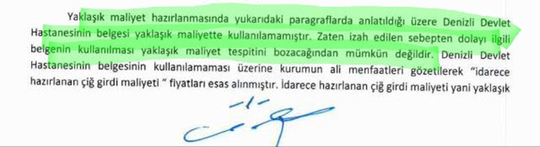 Denizli Devlet Hastanesinden gelen fiyat düşük olmalı ki Makal’ın ifadesiyle “Maliyet hesabını bozacağından yaklaşık maliyette kullanılmamıştır”. Yine “Devlet hastanesinde verilen yemek çeşidi 3 ile sınırlandırılmıştır. Devlet hastanelerinde diyet yemeği yapılmaz. Yapılan yemeğin tuzsuz ve şekersiz hali verilir. Çok az özel diyet yemeği seçilir” gibi bahaneler öne sürülmüştür. Aslında çok rahat verilen rakamlar en azından 3 yemek çeşidine ve diyet yemeği olacak şekilde yaklaşık maliyete katılabilirdi.