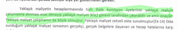 “Yaklaşık maliyetin hesaplanmasında tüm ihale komisyon üyelerinin yaklaşık maliyet çalışmasına alınması esas olmayıp yaklaşık maliyet 3 görevli tarafından çıkarılabilir ve amir onaylar. Yaklaşık maliyet çalışmamız da böyle olmuştur.”