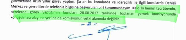 “… Kaldı ki benim tecrübenim, nerelerde görev yaptığımın konuları 28.08.2017 tarihinde toplanan yemek komisyonunda konuşulması olayı ne yeri ne de komisyonun yetki alanında değildir.”