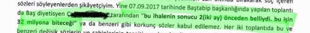 Yine Ayhan makal ilgili yazıda ihale sonrasında 07.09.2017 tarihinde baştabip başkanlığında yapılan toplantıda “Bu ihalenin sonucu 2 ay önceden belliydi. Bu işin 32 milyona biteceği” şeklinde sözlerin ifade edildiğini belirtmiştir.