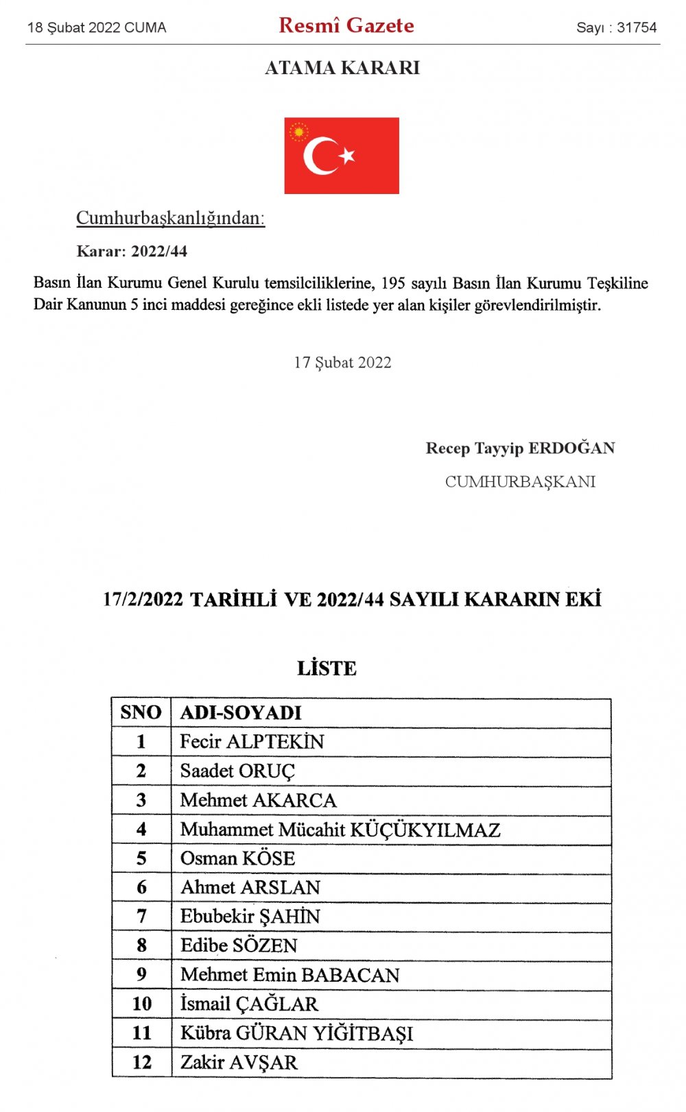 18 Şubat 2022 tarihli atama kararı Cumhurbaşkanı Recep Tayyip Erdoğam imzasıyla Resmi Gazete'de yayımlandı.