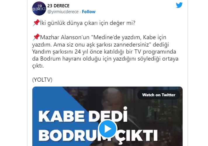 Ünlü sanatçı Mazhar Alanson "Medine’de yazdım, Kabe için yazdım. Ama siz onu aşk şarkısı zannedersiniz" dediği Yandım şarkısını 24 yıl önce katıldığı bir TV programında da Bodrum hayranı olduğu için yazdığını söylediği ortaya çıktı.