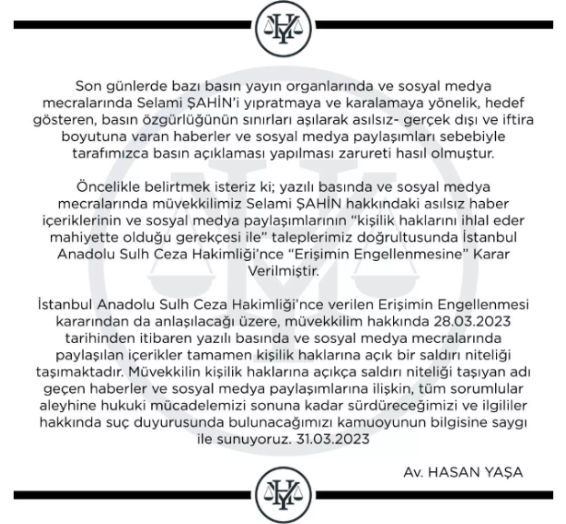 İstanbul Anadolu Sulh Ceza Hakimliği’nce verilen Erişimin Engellenmesi kararından da anlaşılacağı üzere, müvekkilim hakkında 28.03.2023 tarihinden itibaren yazılı basında ve sosyal medya mecralarında paylaşılan içerikler tamamen kişilik haklarına açık bir saldırı niteliği taşımaktadır. Müvekkilin kişilik haklarına açıkça saldırı niteliği taşıyan adı geçen haberler ve sosyal medya paylaşımlarına ilişkin, tüm sorumlular aleyhine hukuki mücadelemizi sonuna kadar sürdüreceğimizi ve ilgililer hakkında suç duyurusunda bulunacağımızı kamuoyunun bilgisine saygı ile sunuyoruz. "