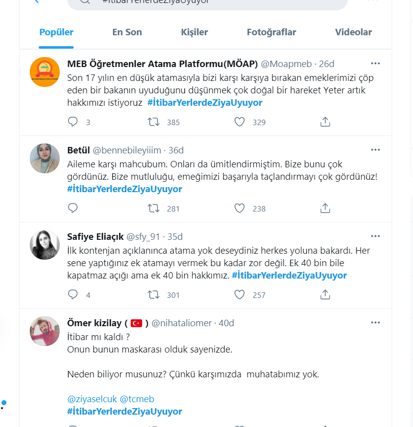 Az önce Türkiye gündemine girerek rekor sayıda tweet atılan "#İtibarYerlerdeZiyaUyuyor" hastag ine atılan bazı tweetler şu şekilde: